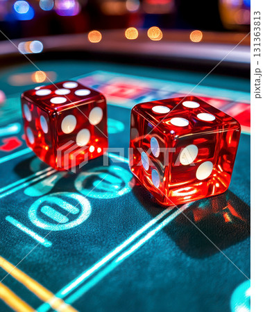 Close-up of red dice on a casino table with vibrant lighting.