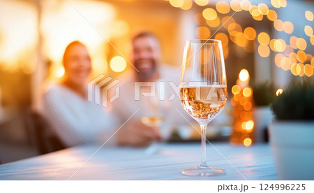 couple enjoys romantic dinner with glass of wine, surrounded by warm lights and cozy atmosphere. Their laughter fills air, creating joyful ambiance