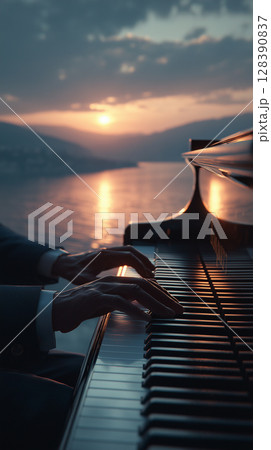 Male hands playing a grand piano keyboard by a lake at sunset, creating a beautiful and evocative scene