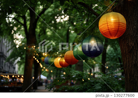 Festive Outdoor Dinner Party Under Twinkling Lights and Red Bann