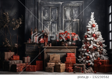 interior of house decorated for Christmas or New Year's holiday, gifts, fir tree, winter season