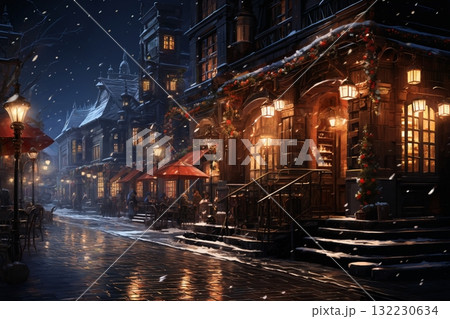 Cozy Snowy Christmas Village Street with Warm Lights and Festive Decorations in Winter Evening