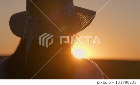 A woman is sitting comfortably, watching the beautiful sunset while wearing a stylish hat