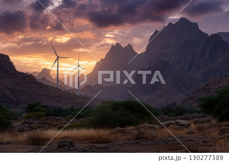 Wind turbines at sunset over rugged mountains with vibrant sky