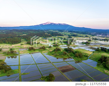 新緑の眺海の森 夕暮れの庄内地方水田風景