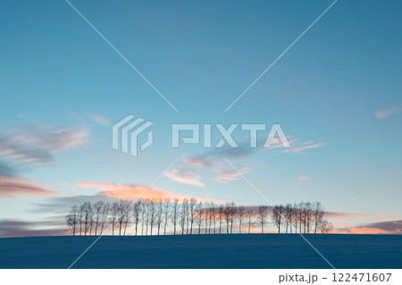 北海道冬の美瑛-夕陽のセブンスターのきの白樺並木-