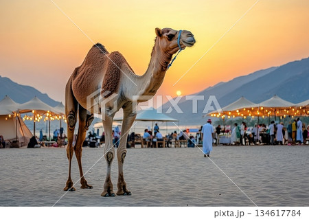 Camel Standing in Desert at Sunset with Tents and People in Background
