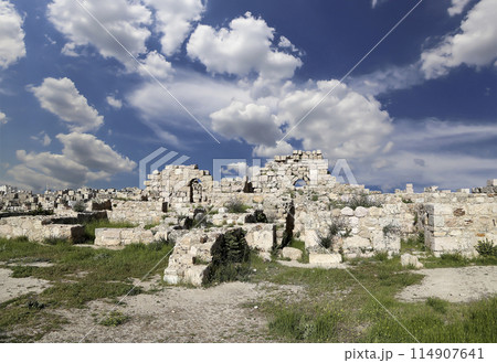 Amman city landmarks-- old roman Citadel Hill, Jordan. Against the background of a beautiful sky with clouds