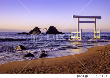 夕暮れ時の美しい二見ヶ浦の白い鳥居と夫婦岩(福岡県糸島市)
