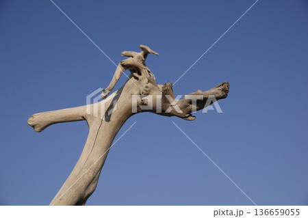 龍の形をした流木と青空