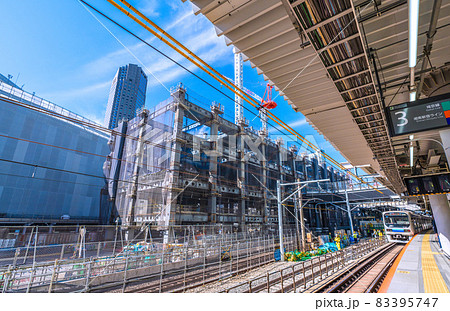日本の東京都市景観 拡張工事。内回りの線路を横に移動させ、ホームを拡幅…=10月24日、渋谷駅