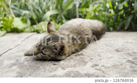 Cute funny kitten scratching his body on the concrete. Gray striped cat lying at yard. Beautiful domestic cat resting outdoor. Concept of adorable domestic animal. Close up