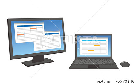 ノートPCと大画面ディスプレイのデュアルモニターのイラスト/白背景