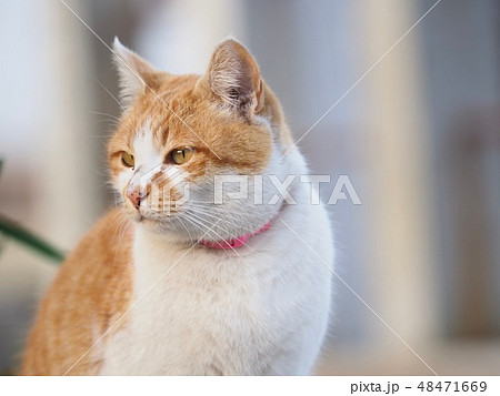 座る首輪をした茶色と白のハチワレ猫