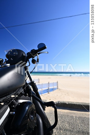 伊豆の海沿いをツーリングするアメリカンバイク