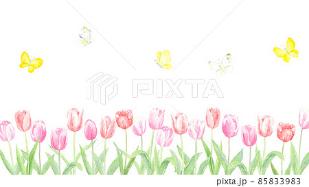 水彩で描いたチューリップとチョウチョ 春の背景イラスト
