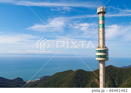 新潟県/ 弥彦山 パノラマタワーと佐渡ヶ島(珍しい回転昇降式展望塔・回転式展望台)