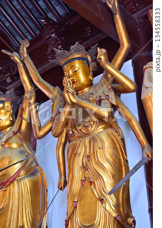 Buddhist deities in the historic Buddhist Jingan Temple on the West Nanjing Road in downtown Shanghai, China