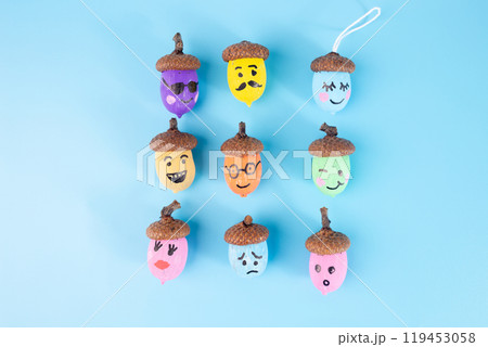 nine acorns painted in various colors with different facial expressions drawn on them. arranged in a 3x3 grid on a light blue background,
