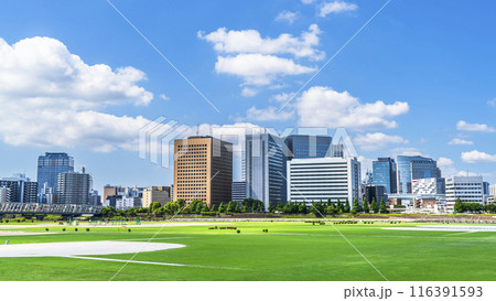青空広がる川崎の街 多摩川緑地と川崎駅前のビル群【神奈川県・川崎市】