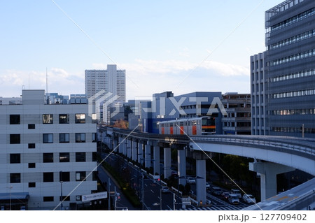 高幡不動駅と程久保駅間を走行する多摩都市モノレール1000系電車