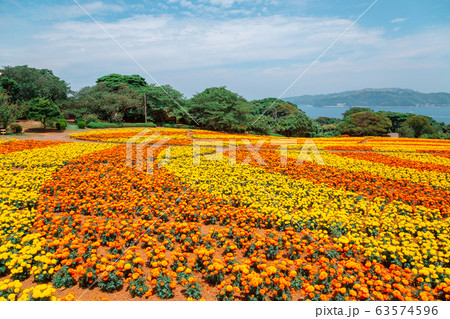 Colorful flower field with blue ocean at Nokonoshima island park in Fukuoka, Japan