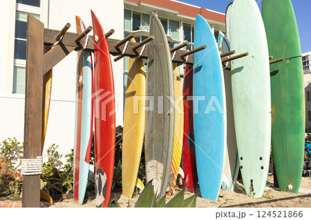 Many Surfboards On Stand Outdoor. Colorful Soft Foam And Wooden Construction Classic Surfboard Longboard Or Malibu. Horizontal. Sunny Day, Seashore Or Ocean. Nobody.
