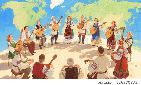 世界の人々が民族音楽を演奏する様子 万博のイメージ
