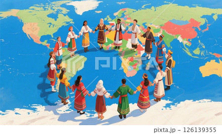 世界地図上に立つ世界各国の人々