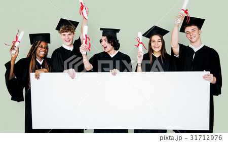 Diverse Students wearing Cap and Gown Showing Blank Copy Space Studio Portrait
