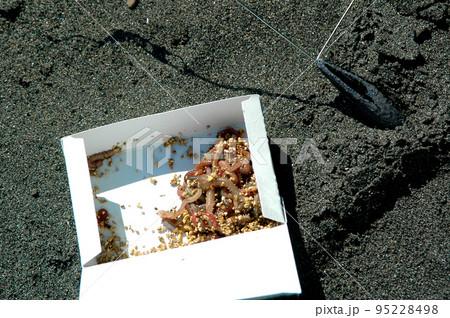 ベテランのエサ箱に収まる赤イソメ、ゴカイ類