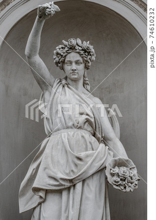 Statue of sensual busty and puffy renaissance era woman in circlet of flowers, Potsdam, Germany, details, closeup
