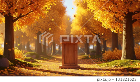 Wooden Podium Centered on Autumn Path with Falling Leaves and Golden Sunlight Scenery