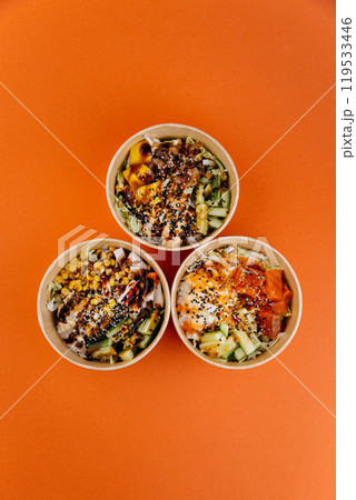 Colorful poke bowls with fresh ingredients arranged on orange background, healthy food concept