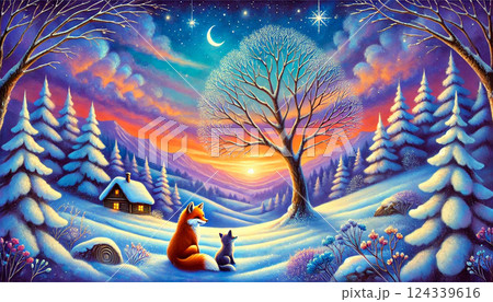 星降る冬の森で、小さな丸太小屋を背に夕陽を見つめるキツネ親子の幻想的で温かなひととき