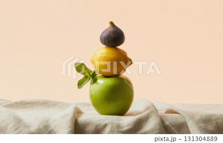 Fresh stack of vibrant fruits, green apple, yellow lemon, and purple fig still life