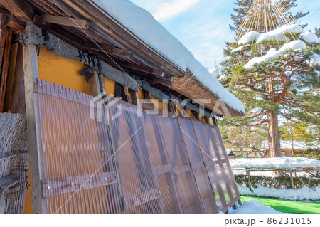 民家住宅の屋根の軒先から垂れ下がる氷柱つらら雪国の日常風景