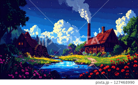 レトロゲーム風の自然なピクセルアート背景(星空と水車が回る静かな村) Generative AI