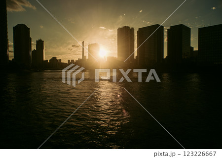 隅田川のリバーシティと中央大橋 (東京・水辺の夕景)