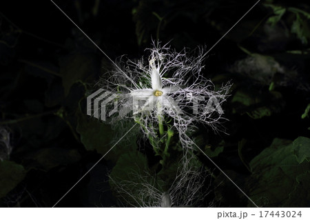 秋にはオレンジ色の長細い実 花は夜咲の一日花妖艶な花 カラスウリ2