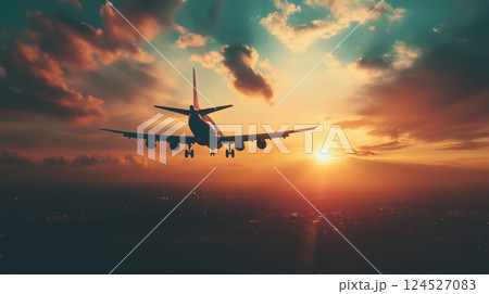 夕焼けの空を背景に飛行機が離陸・着陸する空港の風景空を飛ぶ旅客機