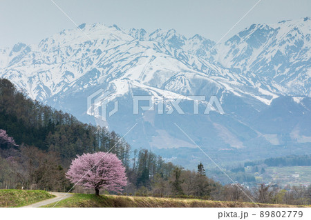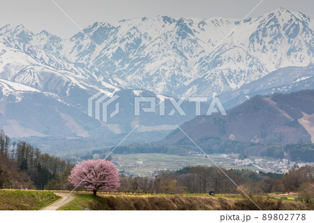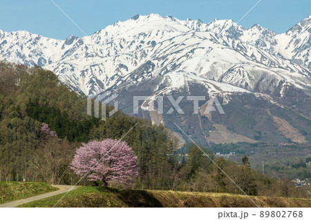 残雪の北アルプスを背景に孤高に佇む一本の桜