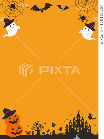 城やお化けが集まっているオレンジ色の空のハロウィンの縦向きのフレームイラスト