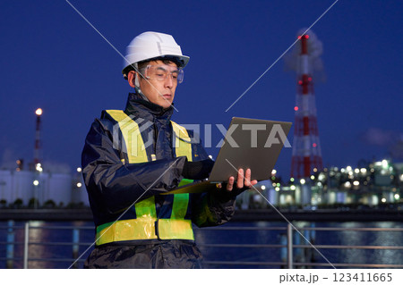 夜間の屋外でPC作業をするヘルメット着用の男性