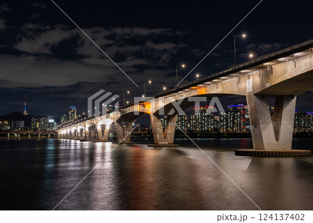 Night view of Han river Hangang and urban cityscape of Seoul, capital of South Korea