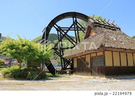 夢すき公園の親子孫水車の親水車と藁葺きの家 岡山県新見市神郷