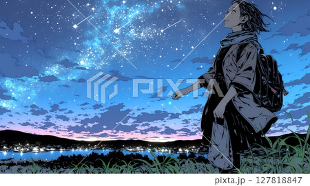 火球:星空を眺めている若い女性