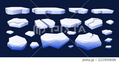 Cartoon floating ice. Antarctic floes pieces and various shapes of glaciers. Frozen arctic blocks of ice in cold water isolated vector illustrations set