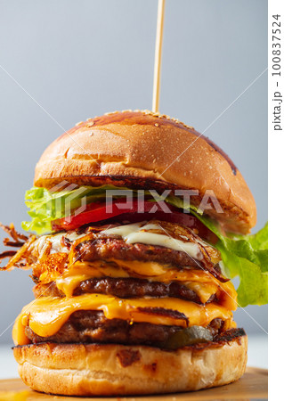 Loaded cheeseburgers three triple, stacked patties stacked high with layers of cheese, lettuce, and tomato. Tall cheeseburger. High quality photo