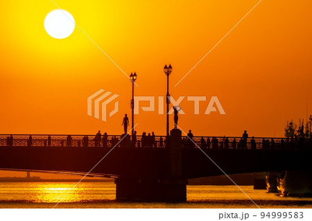 名古屋港 名港トリトン(名港中央大橋)の夕景と沈む太陽